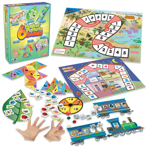 This set of educational games and activities is designed for introducing children to number patterns 1-10. Children will love playing with numbers, counting, and discovering patterns to win each game. These games have been designed at an early level to cover numbers and vocabulary from 1 to 10. Board games printed double sided to help save the environment. After mastering these games, children will be ready to progress to 6 Mathematics Games. Contents: 2 board games, 3 number games, 16 dominoes, die, spinner and counters.