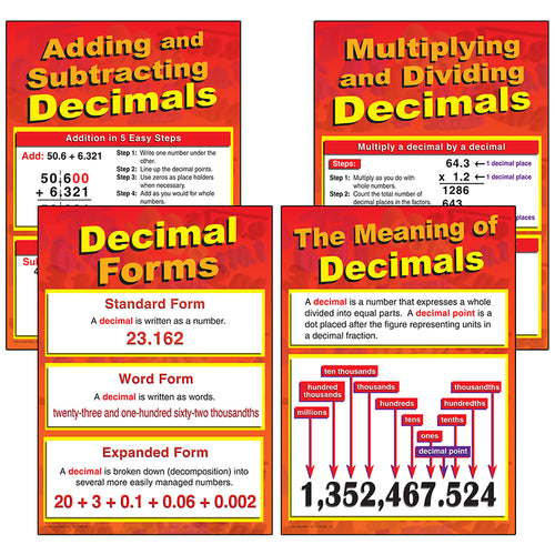 The All About Decimals: Math for CCSS Bulletin Board Set features four charts that reinforce basic concepts related to adding, subtracting, multiplying, and subtracting decimals. The four charts illustrate the meaning of decimals, the different forms of decimals, and the step-by-step procedures used to complete operations with decimals. Aligned with the Common Core State Standards for Mathematics. Includes resource guide with display tips, suggested activities, and worksheets. Great for displaying year-round as a reference. Mark Twain Media Publishing Company specializes in providing captivating, supplemental books and decorative resources to complement middle- and upper-grade classrooms. Designed by leading educators, the product line covers a range of subjects including mathematics, sciences, language arts, social studies, history, government, fine arts, and character. Mark Twain Media also provides innovative classroom solutions for bulletin boards and interactive whiteboards. Since 1977, Mark Twain Media has remained a reliable source for a wide variety of engaging classroom resources.