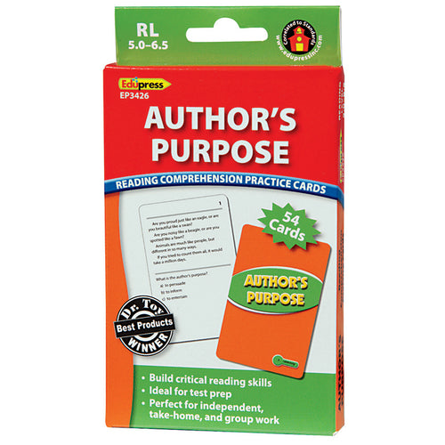 Award-winning cards help students truly understand what they read! Cards feature a leveled passage and a multiple-choice question. Each title focuses on a specific skill and is available in three different reading levels. Perfect for center activities, homework and filling down-time between lessons. A great review for testing! Each pack has 53, 3½ x 5½" self-checking question cards and one instruction card.