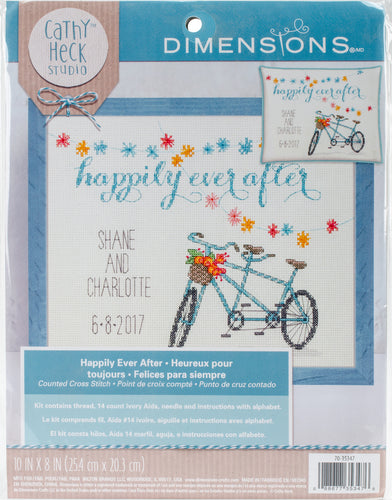 From elegant to whimsical, landscapes to still-life's, realistic to fantasy, no matter your style Dimensions has a fabulous needle-craft kit for you. This package contains 14-count ivory Aida, needle and easy to follow instructions with alphabet. Finished size: 10x8 inches. Design: Happily Ever After. Designer: Cathy Heck. Imported.