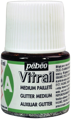 Vitrail Glitter Medium can be mixed with Vitrail colors to obtain bright and glittery effects. It is a part of the Vitrail Auxiliaries, designed to help artists create special effects with ease when working with Vitrail's ultra-gloss finish paints (sold separately). This package contains 45ml of glitter medium. WARNING: Flammable. Keep away from children. Conforms to ASTM D 4236. Imported.