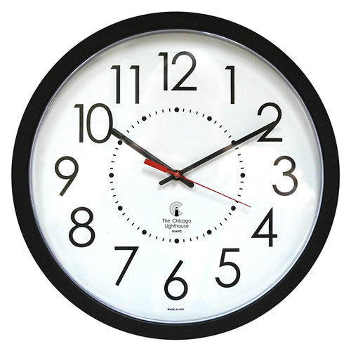 Our Contemporary Series offers a sleek design perfect for modern office settings, work spaces and home environments. A five-foot UL certified chord plugs into any standard outlet so there is no need for a battery. Non-yellowing 12.5" white dial face features bold, easy-to-read Arabic numerals, black hour and minute hands, and red second hand. Clock bodies are durable and biodegradable, made with 30% post-consumer recycled content. Lenses are shatter resistant and UV protected. Each clock is subject to our two-step testing procedure before being packaged. We guarantee the quality and functionality of our clocks with a three-year limited warranty. All Chicago Lighthouse clocks are assembled in Chicago, Illinois by people who are legally blind. Built-in hanging hardware included for ease of use. One AA battery required (not included) for back-up power.
