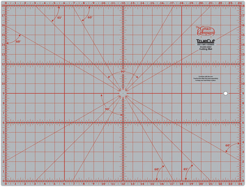 GRACE WOOD-TrueCut Double Sided Rotary Cutting Mat. The double-sided mats are great for all fabric artists. With the light gray background and red & black markings it is easy to read and follow. Featuring 90, 60, and 40 degree angles on both sides. The full surface 1in grid has edge and center markings at 1/8in increments. Mats are available in a variety of sizes. Each sold separately. Imported.