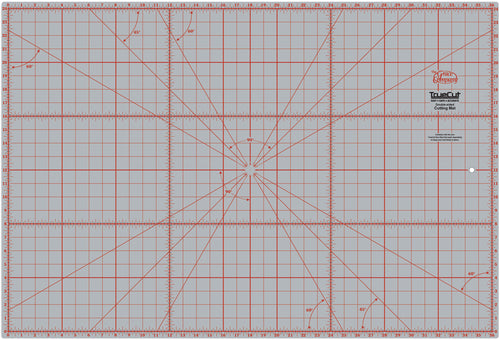 GRACE WOOD-TrueCut Double Sided Rotary Cutting Mat. The double-sided mats are great for all fabric artists. With the light gray background and red & black markings it is easy to read and follow. Featuring 90, 60, and 40 degree angles on both sides. The full surface 1in grid has edge and center markings at 1/8in increments. Mat are available in a variety of sizes: each sold separately. Imported.
