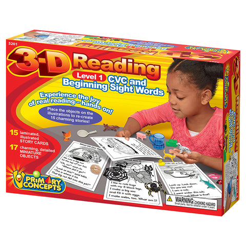 With 3-D Reading kits, the essential skills of phonics, sight word recognition, visualization, and comprehension all come together for beginners in the actual, magical act of reading! Children experience the joy of "getting it"- of moving beyond just recognizing and decoding isolated words on a page, to truly understanding the meaning of passages they have read. Children read and re-read the 15 short, charming stories, written at just the right level for their emerging skills. They demonstrate their understanding of each passage by choosing the appropriate objects and placing them in the correct spots on the illustration of the story. Draw in the missing objects in a reproducible version of the story to keep and show off to friends and family! Each set includes: 15 laminated, illustrated story cards, 17 charming, detailed miniature objects, and teaching guide. Stories include "magic e" words, consonant blends, consonant and vowel digraphs, and more difficult, but essential, sight words.