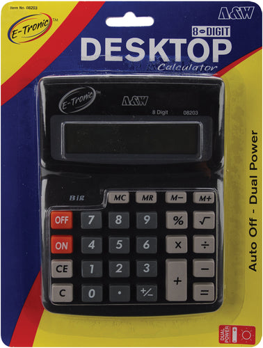 A&W OFFICE SUPPLIES-Desktop Calculator. This desktop calculator features solar powered with battery back-up, power on/off switch, an eight digit operation, full function memory, easy to read display and is constructed of black plastic. Calculator measures 5-1/4x4-1/4in. Imported.