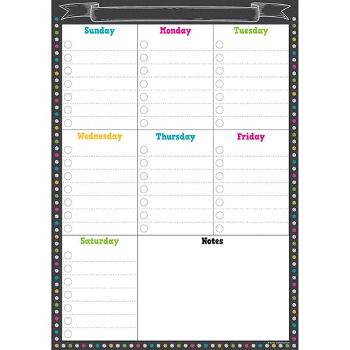 Keep track of your daily and weekly activities with the Chalkboard Brights Clingy Thingies Weekly Schedule. The write-on/wipe-off surface makes it easy to jot down your schedule and then quickly wipe it clean for the next week. Measures 12" x 17".