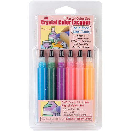 SAKURA-Create 3D effects. Enhance and beautify any art image. Each pastel color has a 0.35 mm fine tip, is easy to use, and has a pen style applicator. Water base net 0.5 fluid ounces per color. Acid free and non-toxic. Conforms to ASTM D4236. Adult supervision strongly recommended for usage by children. Allow 15 to 30 minutes for the lacquer to dry before applying more on top. Colors: Pastels. Also includes 1 cleaning pin.