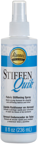 ALEENE'S-Stiffen Quik Spray. This is a quick drying and easy to use fabric stiffening spray. This clear drying formula is great for fabrics, yarns, ribbons, lace and much more! Stiffen Quik dries in approximately 1 hour naturally or 30 minutes in the microwave. Projects can be reshaped by simply washing it in warm water with detergent. This package contains one 8oz/236ml pump spray bottle. Contents conform to ASTM D4236. Made in USA.