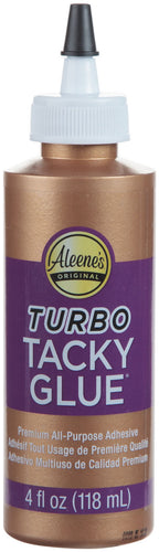 I LOVE TO CREATE-Aleene's: Turbo Tacky Glue. Looking for an all- purpose adhesive that dries even stronger and faster than Original Tacky Glue? Trust Turbo Tacky Glue for your projects that require a little more muscle in a little less time! It dries clear, flexible and permanent in as little as 35 minutes and can withstand both heat and cold. This package contains one 4 fl.oz. bottle of Turbo Tacky Glue. Acid free, non-toxic. Made in USA.