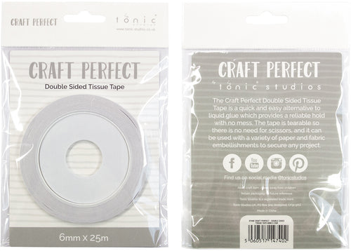 The Craft Perfect Double Sided Tissue Tape is a quick and easy alternative to liquid glue. It provides a reliable hold with no mess. The tape is easy to tear so there is no need for scissors, and it can be used with a variety of paper and fabric embellishments to secure to any project. This package contains 27.3 yards of .23 inch wide double-sided tissue tape. Imported.