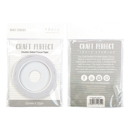 The Craft Perfect Double Sided Tissue Tape is a quick and easy alternative to liquid glue. It provides a reliable hold with no mess. The tape is easy to tear so there is no need for scissors, and it can be used with a variety of paper and fabric embellishments to secure to any project. This package contains 27.3 yards of .47 inch wide double-sided tissue tape. Imported.