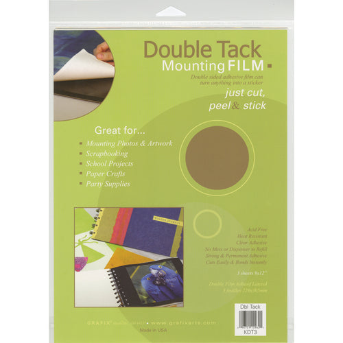 GRAFIX-Archival Double Tack Mounting Film. This double-sided adhesive can turn anything into a sticker! Just cut, peel and stick. It is great for mounting photos and artwork, scrapbooking, school projects, paper crafts and party supplies. This package contains three 9x12 inch sheets of double-sided mounting film. Acid Free. Made in USA.