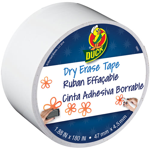 ShurTech-Dry Erase Duck Tape: White. Perfect for hard, smooth surfaces such as metal, glass and plastic. Make your own dry erase surfaces for messaging, labeling and fun! Write on with a standard dry erase marker; erase with an tissue, cloth or eraser (sold separately). This package contains 15 yards of 1-7/8 inch wide dry erase tape. Conforms to ASTM D 4236. Imported.