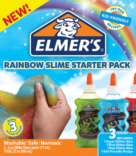 Elmer's safe, nontoxic, and washable glues are the secret to endless slime fun! Create your own sparkly rainbow slime with this 3 colored glitter glue pack that will brighten up any day! This package contains one Classic Glitter Glue in Green (6oz), one Classic Gllitter Glue in Blue (6oz), one Classic Glitter Glue in Red (6oz) and one Kid-Friendly Recipe. WARNING: Choking Hazard. Not suitable for children under 3 years. Conforms to ASTM D4236. Imported.