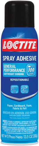 Loctite Spray Adhesive General Performance is a premium quality formulation that dries clear and has a superior bonding strength. It dries quickly and is ideal for a wide range of household and automotive repair projects. Works on a variety of porous and nonporous substrates. This package contains 13.5oz of spray adhesive. WARNING: Content under pressure. Conforms to ASTM D 4236. Extremely Flammable. WARNING: This product contains chemicals known to the state of California to cause cancer, birth defects or other reproductive harm. Do not mouth or chew. Made in the USA.