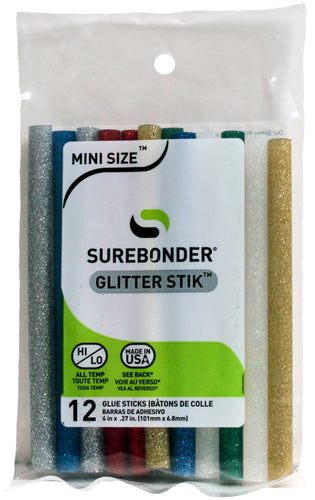 Surebonder-All Temp Glitter Stik Mini Glue Sticks: Value Pack. Popular for a variety of hobby & crafts, art, school and kid projects. Decorate cloths, jewelry and paper! This package contains twelve 4 inch long mini glue sticks in six different glitter colors (two of each color). Non-toxic. Conforms to ASTM D 4236. Made in USA.