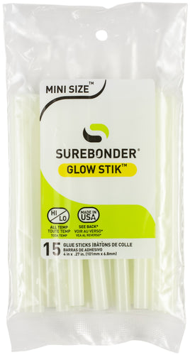 FPC-Surebonder: Glo Stiks. A Glo Stik is a glow-in-the-dark glue stick--great for all kinds of Halloween, craft, art, and school projects! This package contains fifteen mini glue sticks for use in high, low, or dual temperature mini glue guns. Each one is 4 inches long with a diameter of .27 inches. (101mm x 6.8mm). Conforms to ASTM D-4236. Made in USA.
