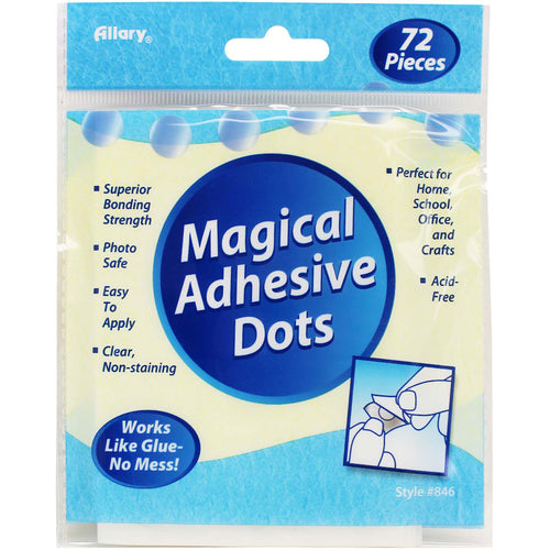 ALLARY-Magical Adhesive Dots. These adhesive dots work like glue but without the mess--great for home, school, and office projects! They have superior bonding strength and are safe for use on photos. Each one is clear and has a 1/2 inch diameter. This package contains seventy-two adhesive dots. Conforms to ASTM D4236. Imported.