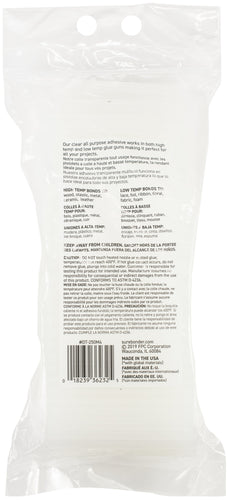 This all-purpose adhesive works in both high temp and low temp glue guns. Perfect for all of your projects This 6.5x14 inch package contains 250 clear glue sticks. WARNING: Choking Hazard. Not suitable for children under 3 years. Made in USA.
