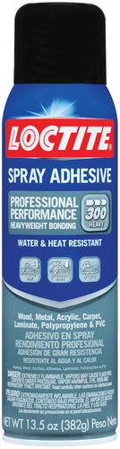 HENKEL-Loctite: Professional Performance Spray Adhesive. This spray adhesive bonds wood, metal, glass, carpet and plastics. It offers heavyweight bonding that is both water and heat resistant and is recommended for use on laminate, trim, molding, marine applications, upholstery, carpeting, van or motor home conversions, kick plates, and signage. This package contains one 13-1/2 ounce aerosol can of spray adhesive. WARNING-EXTREMELY FLAMMABLE. VAPORS HARMFUL. CONTENTS UNDER PRESSURE. EYE, SKIN, AND RESPIRATORY TRACT IRRITANT. Made in USA.