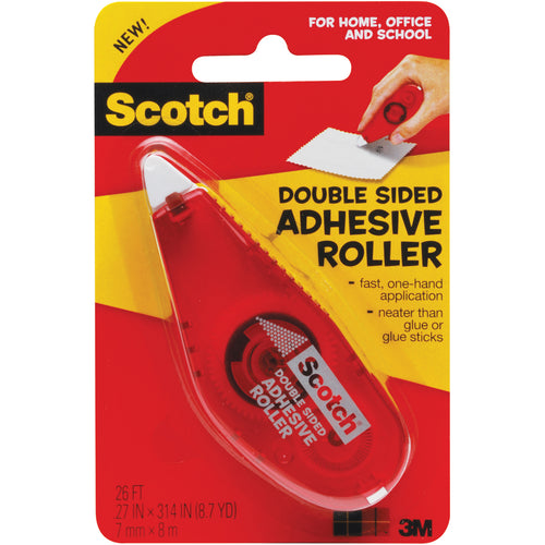 3M-Scotch: Double-Sided Adhesive Roller. The Double-Sided Adhesive Roller is the fast no-mess way to apply double-sided adhesive. It rolls on easily and unlike glue and glue sticks, there is no drying time and no wrinkling. Great for home, office, and school projects! This package contains one applicator tool filled with 26 feet of .27-inch-wide double-sided adhesive. Photo safe. Conforms to ASTM D4236. Imported.