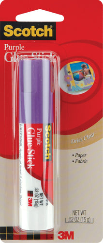 3M-Scotch Purple Glue Stick. The purple color of this glue stick makes it easy to see when applied, but dries clear and unnoticeable. The glue is strong and bonds well to both paper and fabric. The acid-free formula is non-toxic and cleans off hands and household surfaces easily with soap and water. This package contains one 0.52oz tube of glue stick adhesive. Conforms to ASTM D 4236. Imported.