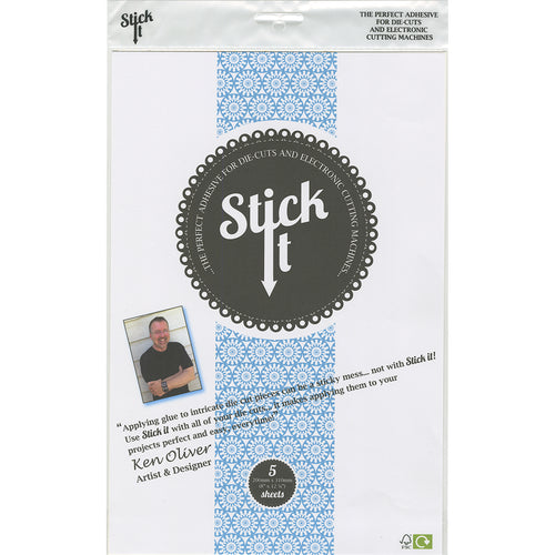 Stick It-Adhesive Sheets. Stick It has been formulated for intricate die-cutting and use with electronic cutters. It is temporarily repositionable, but will become permanent over time. Apply to your paper or cardstock prior to cutting then simply peel backing off when you're ready to apply to your project. Acid-free, water based adhesive. This package contains five 8x12-1/4 inch adhesive sheets. Imported.