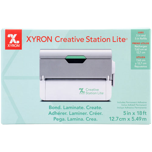 Xyron-Creative Station Lite Machine: White/Silver. This machine is a compact all-in-one tool for adding adhesive, magnet or lamination to your creative projects. It accepts two different sized refill cartridges, minimizing waste and maximizing flexibility for your smaller sized projects. There is no heat, no batteries or electricity required. Drop-in refill cartridges allow you to switch applications quickly and easily (sold separately). This 6x9-1/2x5- 1/2 inch package contains one 5 inch machine and 18 feet of 5 inch permanent adhesive. Imported.