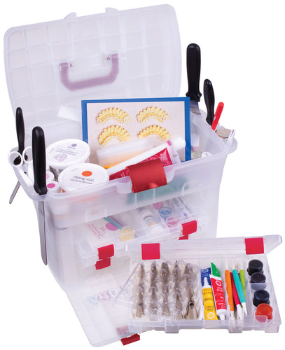 ARTBIN-Bakers Cupboard Decorating Supply Cabinet. Conveniently store your baking tools in this decorating supply cabinet. This package includes one translucent 13x15x8 inch supply cabinet with cover and red latches and three 7x10-3/4x1-1/2 inch storage boxes, two tip trays and a 8x15x3 inch bulk storage area on top. Made in USA.