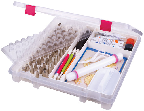 ARTBIN-Baker's Cupboard Decorating Supply Satchel. store your baking tools in this decorating supply case. The removable trays hold up to 60 tips and accessories (not included). This package includes one translucent 14x14 inch supply case with cover and red latches, one 14x5 inch tip case and one 14x8-1/2 inch tray. Made in USA.