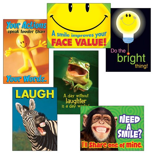 Lively visuals and popular themes energize learning, spark discussions, build character, and encourage new ways of looking at life. The results are motivated, successful individuals who reflect the positive attitudes and behaviors portrayed in these creative themes. Includes A day without laughter, Your actions speak louder, Need a smile?, A smile improves your face value!, Do the bright thing, and Laugh. Versatile and durable. Value-packed savings! 6 posters, 13.375" x 19".