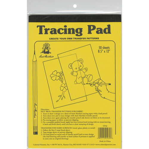 AUNT MARTHA-Hot Iron Transfer Paper. Use with hot iron transfer pencils to create iron-on transfers for just about any use from just about any source: magazines, photographs, coloring books and much more. This pad contains fifty 12x9in tracing paper. Made in USA.