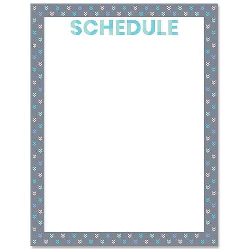 The modern design of this Calm & Cool Schedule Chart features a classic gray background with multi-colored mini chevron pattern. It is great for a variety of classroom and school settings. This chart features an open writing space that can be easily customized to any class or school schedule.