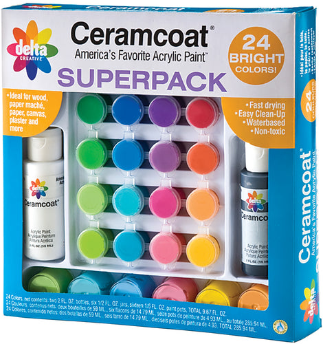 Ceramcoat Acrylic Paint comes in rich, vibrant colors and has a creamy, smooth consistency for one coat coverage that dries to a uniform, matte, permanent finish. This paint is perfect for a wide variety of hard surfaces: wood, paper-mache, primed metal, plaster, resin and bisque. This 9.5x9.5 inch package contains two 2 fluid ounce paint bottles, six .5 fluid ounce paint pots, sixteen .16 fluid ounce paint pots for a total of 24 colors. Conforms to ASTM D4236. Imported.