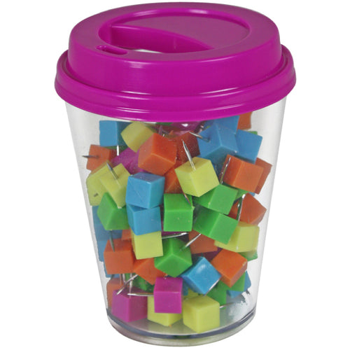 The Pencil Grip-Coffee Cup Storage With Push Pins: Assorted. A fun way to store supplies for journals, scrapbooking, home office and more! This package contains one 4-1/4x3x3 inch storage cup with 120 push pins in assorted colors. Imported.