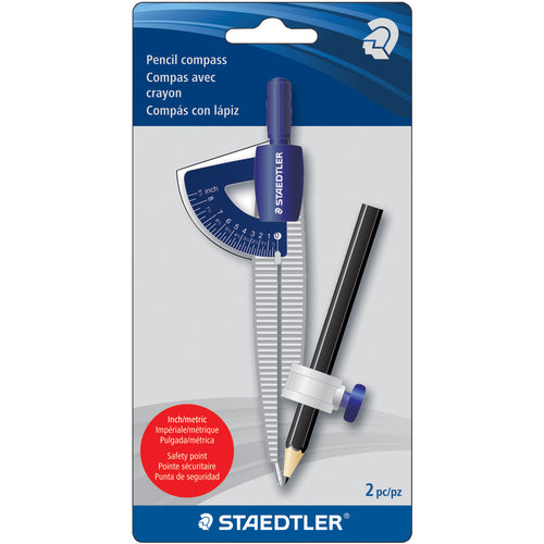 Staedtler-Compass With Pencil. This compass is perfect for any student! This 7-1/4x3-3/4x1/2 inch package contains one compass with blunt safety point and easy-to-read graduations in both inches and centimeters, and one pencil. Maximum circle diameter: 12 inches. Imported.