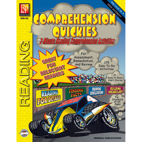 Reluctant readers of all ages and those reading below grade level are sure to have fun while they improve their reading skills with Comprehension Quickies! Very short, easy-to-read paragraphs are followed by comprehension activities that require students to pay attention to details, understand the content, know word definitions, draw conclusions, write complete-sentence answers, and more.