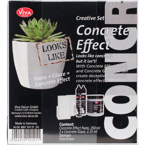 Viva Decor-Concrete Effect Paste Kit: Grey. Create deceptively realistic concrete effects on different objects! This package contains 8.5oz of concrete paste, 0.95oz of light concrete glaze, 0.95oz of dark concrete glaze, four sponges and one instruction sheet. Imported.