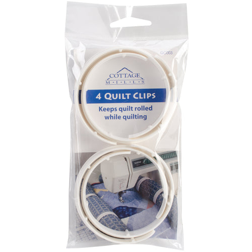 COTTAGE MILLS-Quilt Clips. These fantastic clips keep quilts rolled while quilting! They won't rust, stain or nag, wont scratch machines or furniture and have the same spring as metal! This package contains four 3 inch quilt clips. Imported.