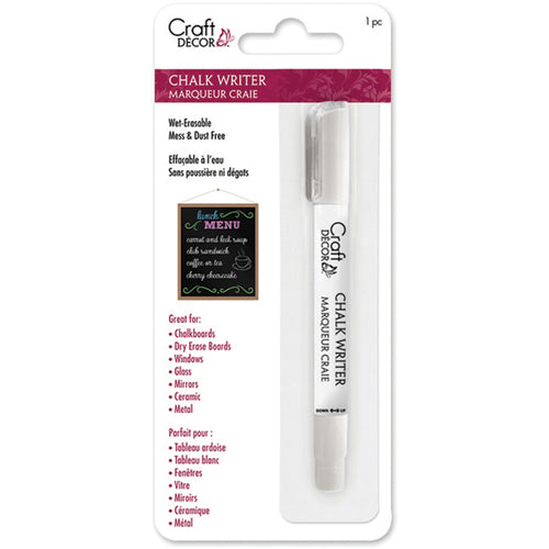 Multicraft Imports-Craft Decor Chalk Writer. Great for chalkboards, dry erase boards, windows, glass, mirrors, ceramic and metal! Chalk writers are designed for giving the appearance of chalk without the mess & dust. These vibrant blendable colors write smoothly and dry quickly leaving a smear free chalk finish. This package contains one chalk writer with a wet eraser. Comes in a variety of colors. Each sold separately. Conforms to ASTM D 4236. Imported.