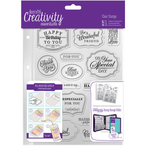 Docrafts-Creativity Essentials A5 Clear Stamp Set: Trad Sentiment. Print, pattern and layer with these innovative clear stamps! Easily file away in the Creativity Essentials Stamp Storage Folder (sold separately). This package contains eighteen clear stamps on one 8- 3/4x6-1/4 inch backing sheet within one A5 pocket. Imported.