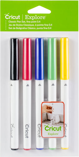 Add colorful messages or drawings to your projects with the Cricut Classic Pen Set using the Cricut Maker, Cricut Explore One (requires Accessory Adapter), Cricut Explore, and Cricut Explore Air. Pens are water-based, acid-free, nontoxic, and permanent after dry. Package includes five fine-point pens in red, yellow, green, blue, and black. Imported.