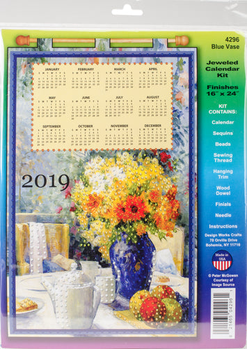 Soft colors accented by sequins make these calendars a lovely addition to your home decor. This package contains one calendar, sequins, beads, sewing thread, hanging trim, one wood dowel, finials, one needle and instructions. Finished Size: 24x16 inches. Made in USA.
