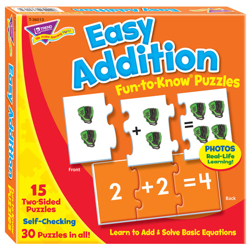 Everybody loves a challenge! Help children build confidence and achieve success with fun 3-piece puzzles that hone their skills at their own pace. Only matching pieces fit together, so kids can learn by trial and error. Practice addition. Photos for real-life learning on front, numbers on back. Durable, 3" x 3" pieces. Sturdy storage box. 15 two-sided, three-piece puzzles. 45 pieces. For ages 5 and up.