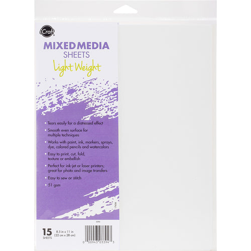Thermoweb-iCraft Mixed Media Sheets: Lightweight. These sheets are a new art surface that can be colored like paper and stitched like fabric. Easily print onto them from laser or ink-jet printers. The lightweight sheets are translucent, ideal for layering, and tear easily. This package contains fifteen 11x8-1/2 inch mixed media sheets. Made in USA.