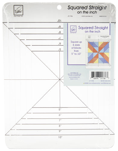 JUNE TAILOR-Squared Straight On The Inch. Keep quilting construction on the straight and narrow by squaring up quilt blocks first with June Tailor's Squared Straight Rulers. Squares six sizes of blocks in one inch increments with each ruler. On The Inch Ruler will square blocks from 5 to 10 inches. Use cross-hair markings to center virtually any block. Diagonal lines make it easy to center and cut half-square and quarter-square triangle blocks as well as fussy cut. Made in USA.
