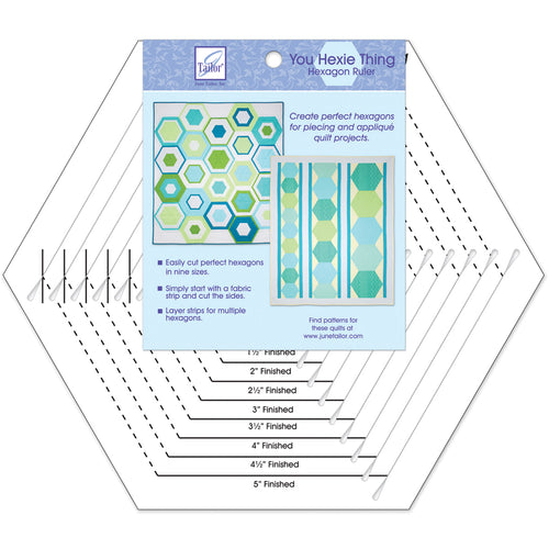 JUNE TAILOR-You Hexie Thing Hexagon Ruler. Create the perfect hexagons for piecing and applique quilt projects! You can easily cut perfect hexagons in nine sizes. Simply start with a fabric strip and cut the sides, and layer the strips for multiple hexagons. Can measure finished pieces at 1-1/2 to 6 inches. This package contains one acrylic hexagon ruler. Made in USA.