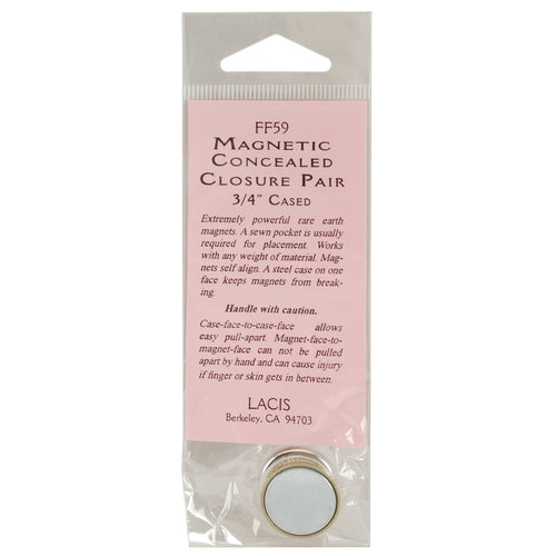 LACIS-Concealed Magnetic Closure Pair. Extremely powerful rare earth magnets designed to be concealed for bag closures. A sewn pocket is usually required for placement. Works with any weight material. Magnets self align. A steel case on one face keeps magnets from breaking. Case face to case face allows easy pull-apart. Face to magnet face can not be pulled apart by hand. This package contains one pair of 3/4 inch cased magnets. Imported.