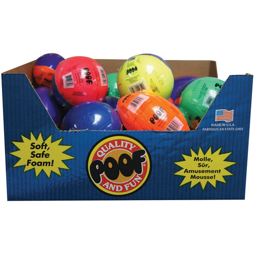 POOF Mini Foam Sports Ball 24 pack assortment includes 6 inch footballs, 4 inch basketballs and 6 inch spiral footballs that will provide endless beach, pool, backyard and indoor entertainment. They are made from soft, safe foam. The assortment has 24 individually shrink-wrapped, multi-colored balls. Box measures 15.25 x 9.5 x 12.75 inches and turns into a countertop display measuring 15.25 x 8 x 12.75 inches with indentations on two sides. Instructions to make display box included on side of box. The number of footballs and basketballs may vary per box. Recommended for children 5 years of age and older. Made in the U.S.A.